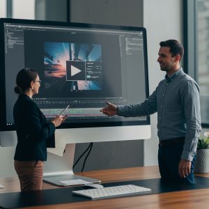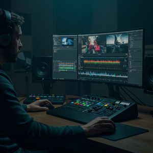 Video production session in a professional editing suite, showcasing advanced editing tools and techniques.